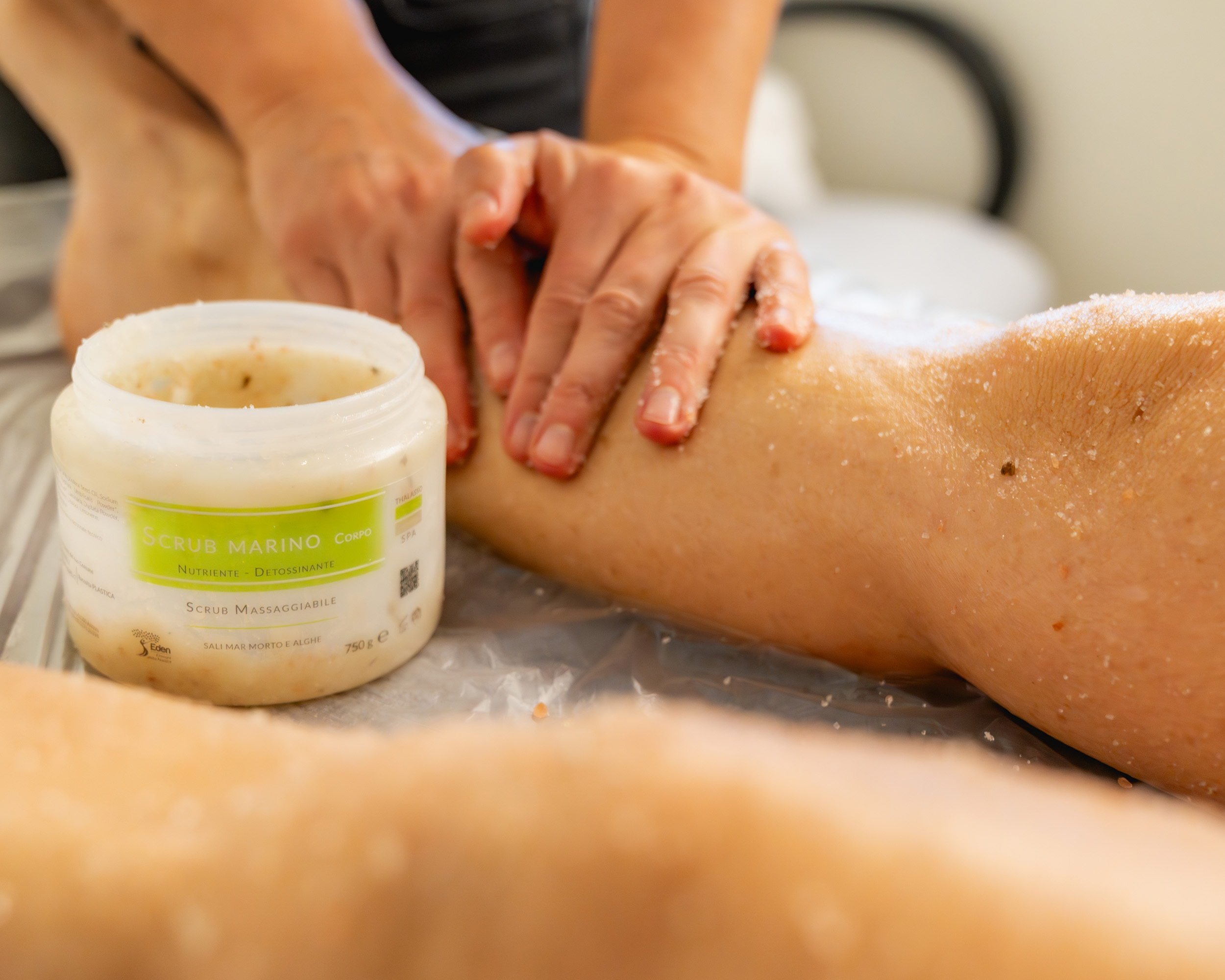 Il trattamento inizia con una rinnovazione manuale mediante uno scrub marino composto da: